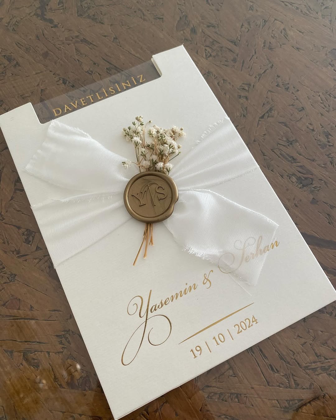 Embossed Inset wedding card pouch with ribbon dry flowers and customized wax stamp